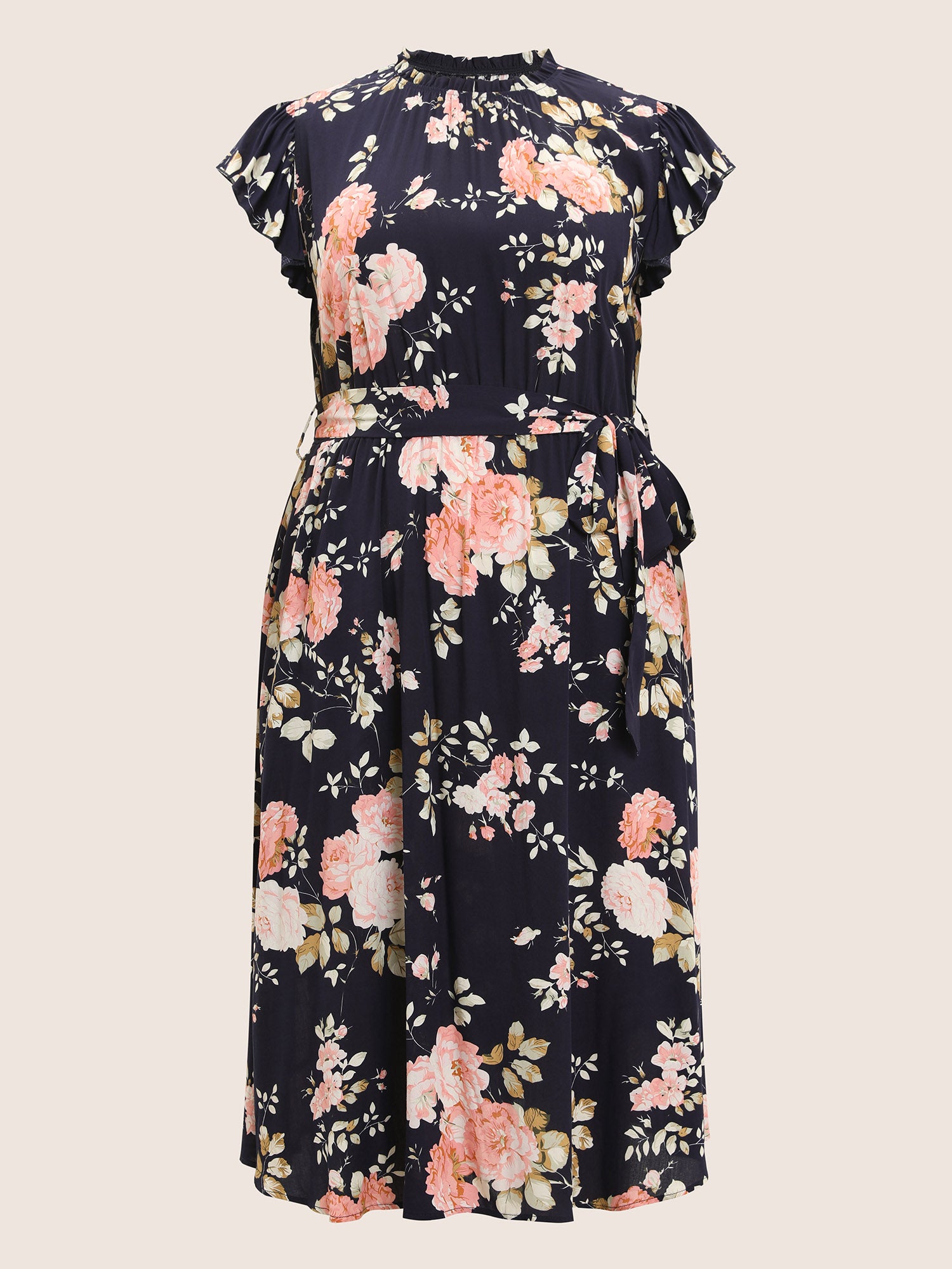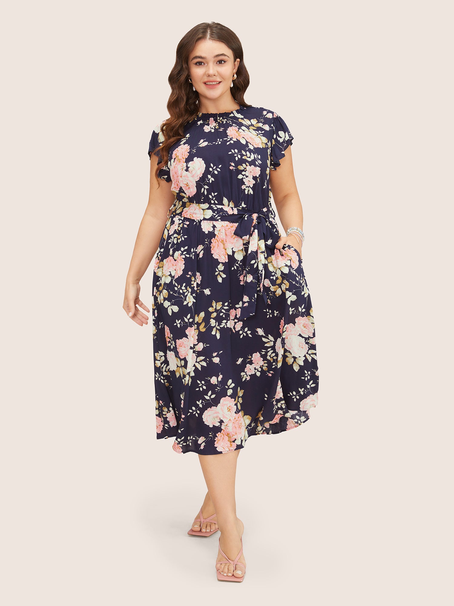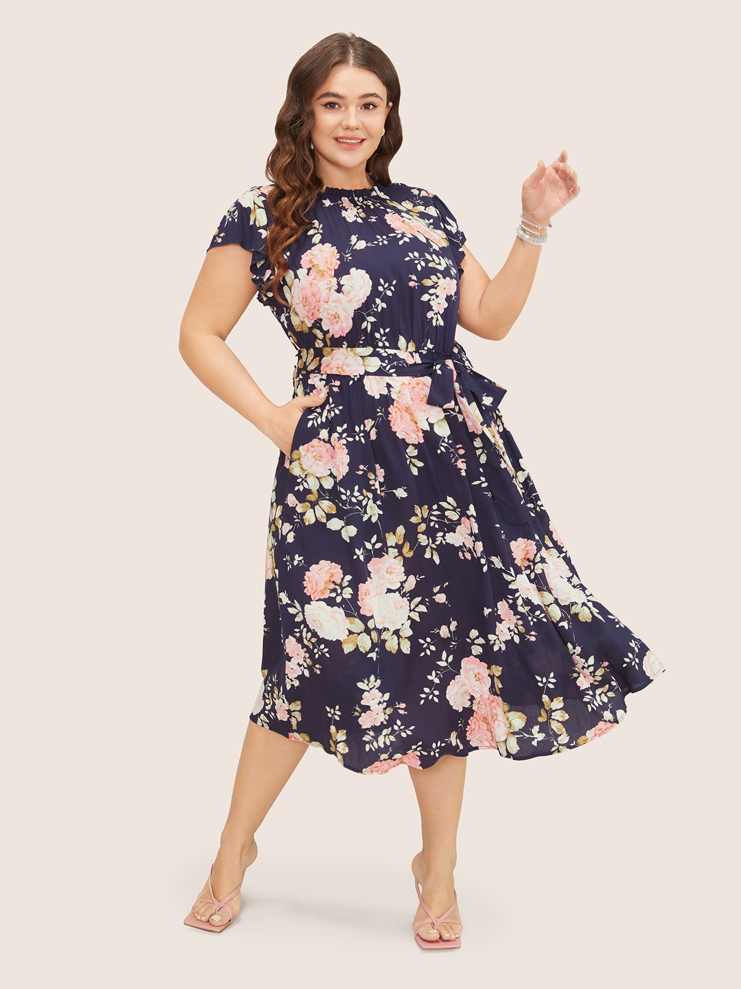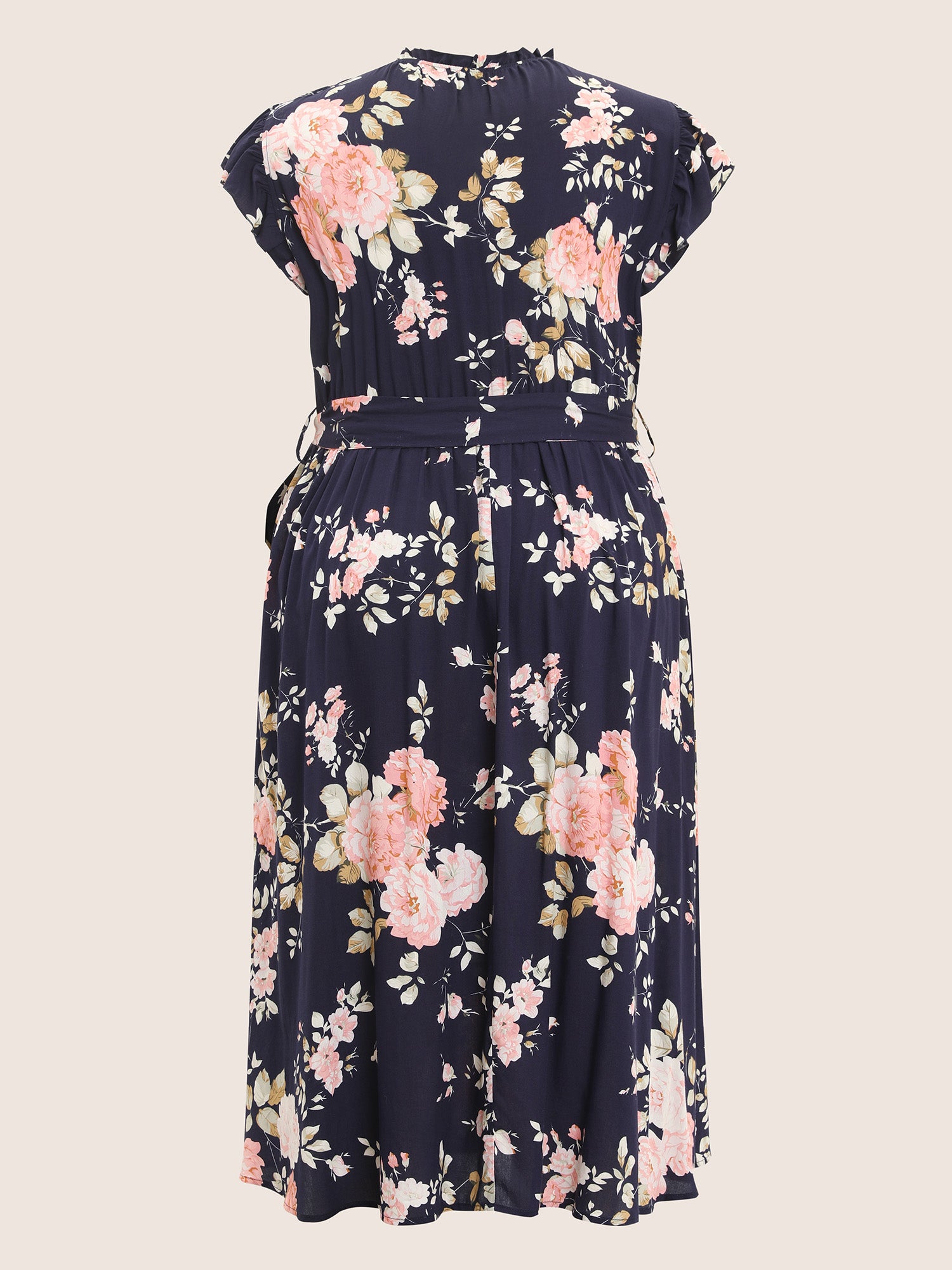 Floral Frill Trim Mock Neck Pocket Ruffle Belted Cap Sleeve Dress