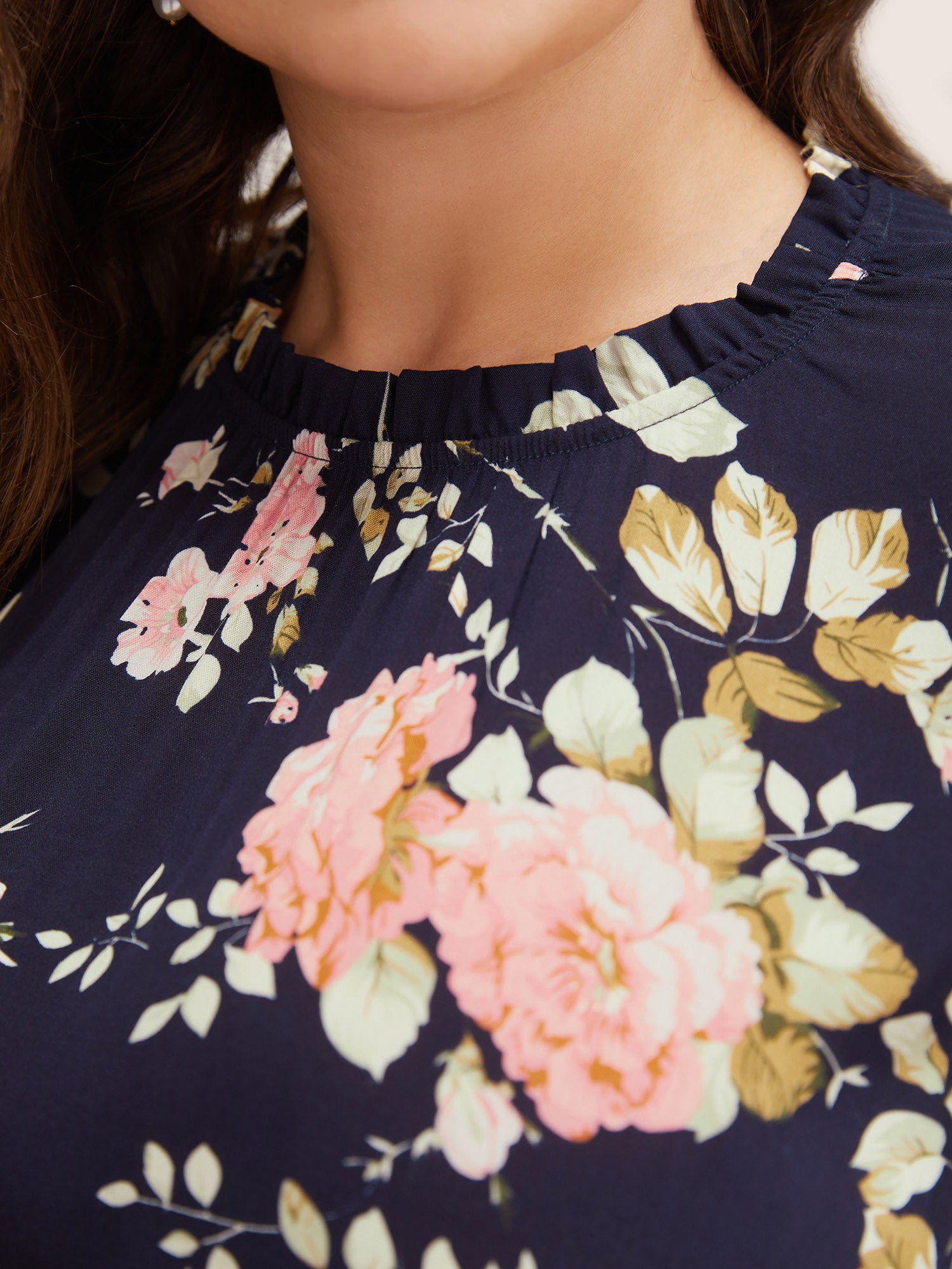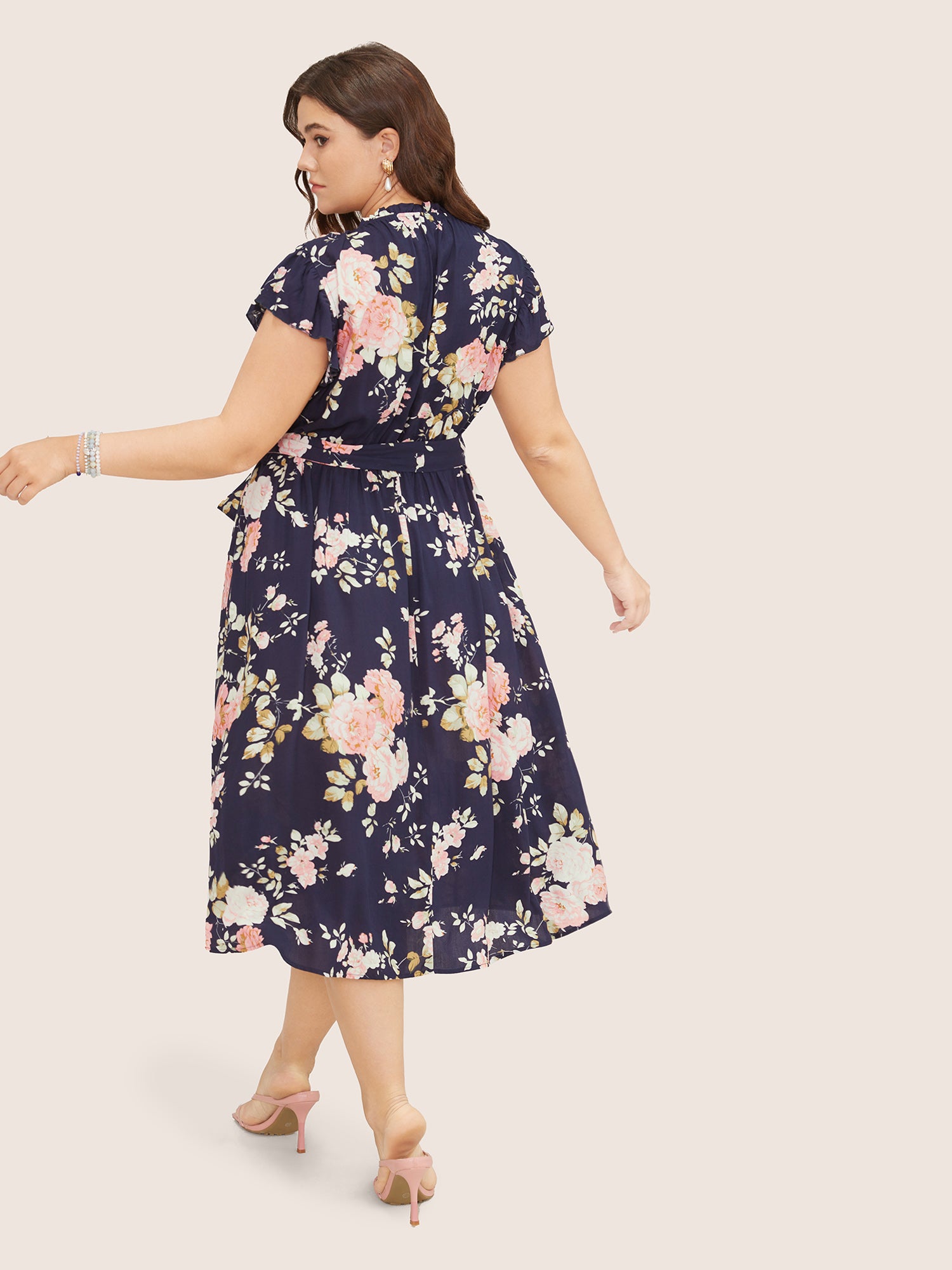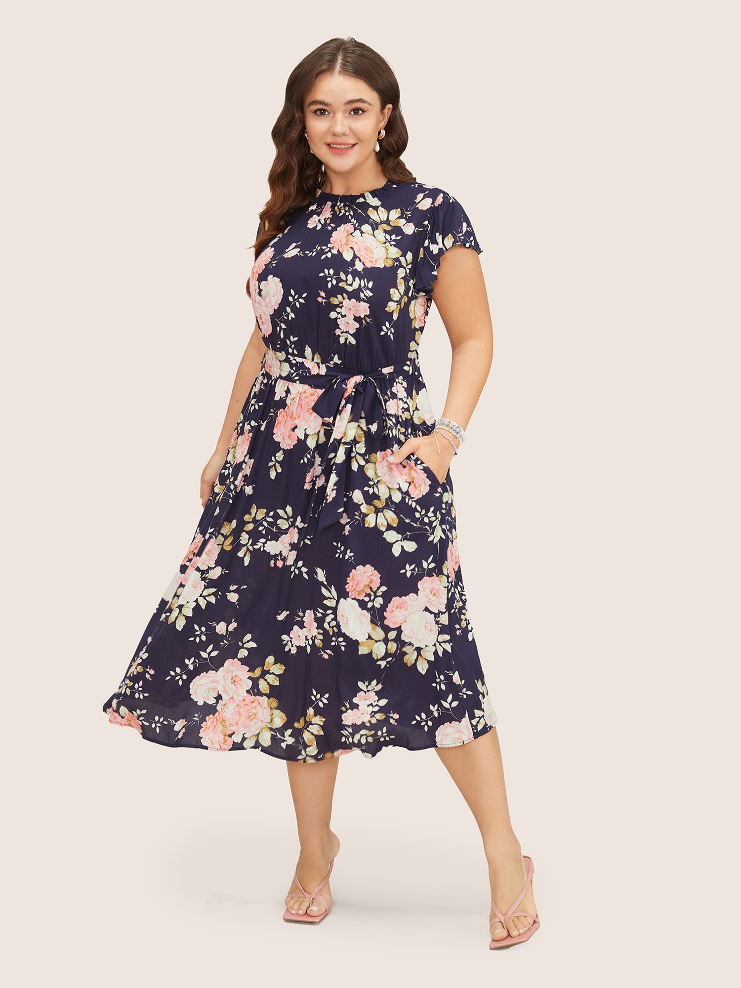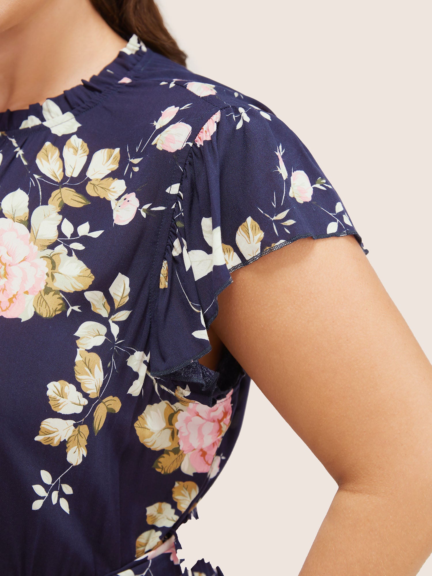Floral Frill Trim Mock Neck Pocket Ruffle Belted Cap Sleeve Dress