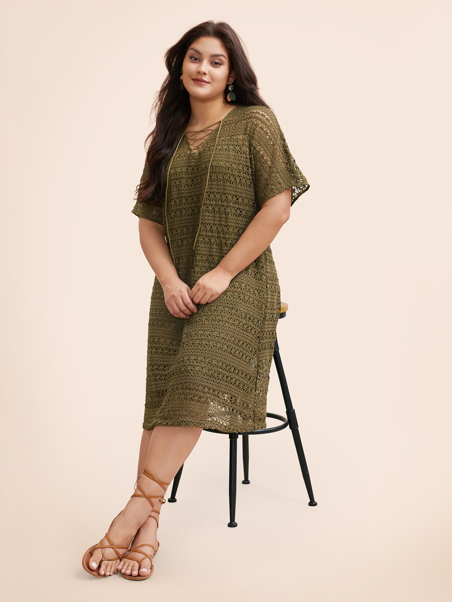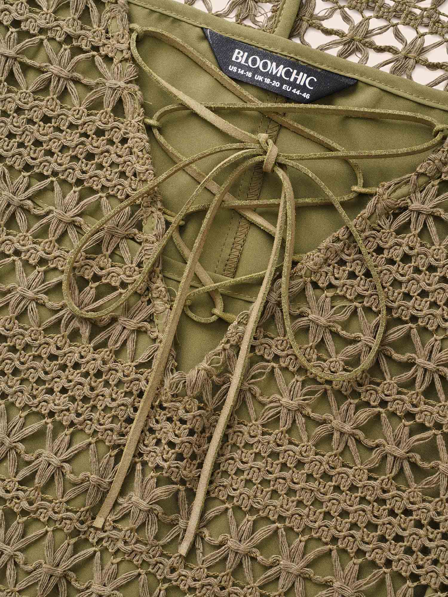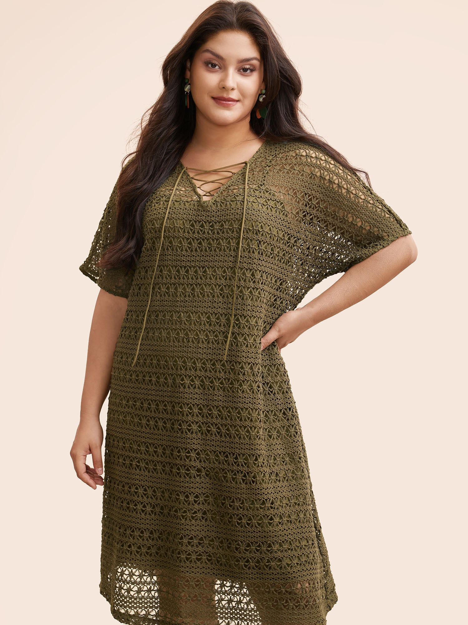 Crocheted Lace Up Dolman Sleeve Tiered Dress