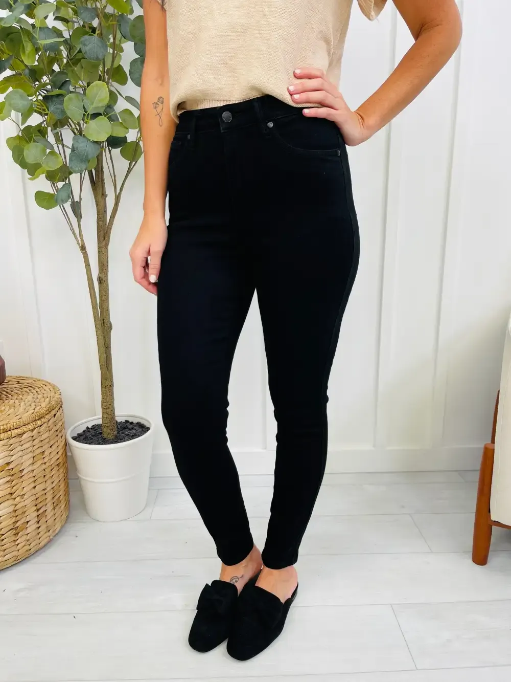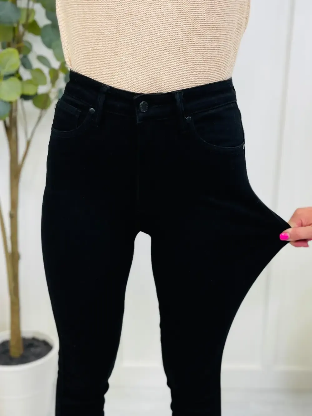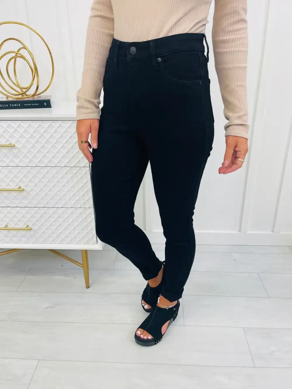These black tummy control jeans feature our viral tummy control panel that sucks you in and slims you out in all of the right places without sacrificing stretch! You will never feel as confident as you do in these solid black tummy control jeans!